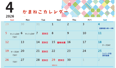2026年4月の営業スケジュールは以下の通りです。 定休日: 7( 火)、14( 火)、21( 火)、28( 火)、29( 祝 水) 臨時休業:15( 水) 貸切営業: 25( 土) かまねこシェリーの会 4/6( 土)…