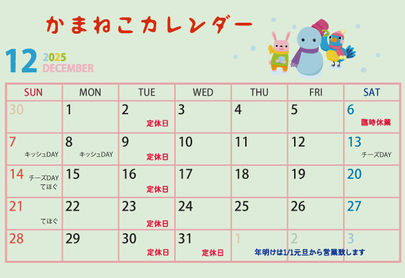 12月の営業スケジュールは以下の通りです。