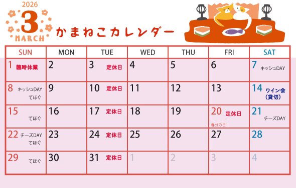 ■定休日: 3(火)、10(火)、17(火)、20(祝)、24(火)、31(火)