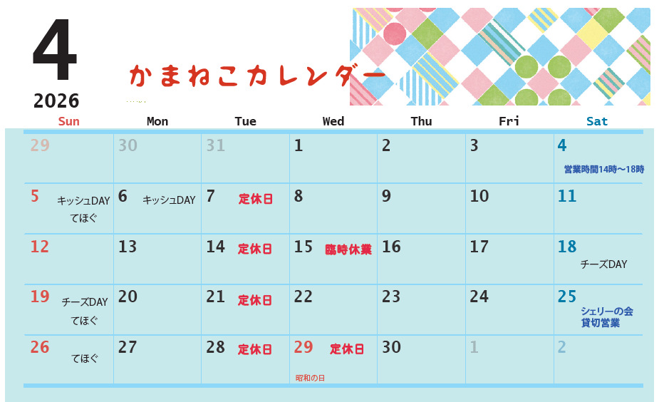 2026年4月の営業スケジュールは以下の通りです。