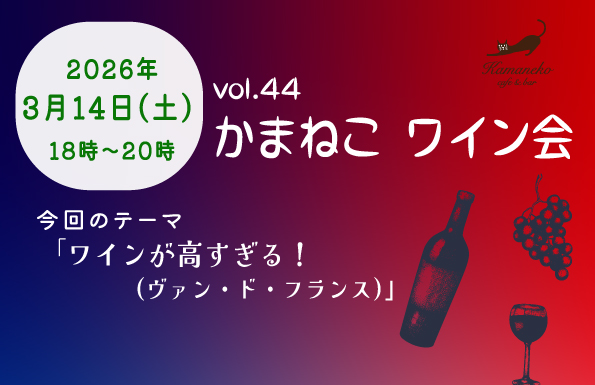 2026年3月14日(土)18時から、カフェ&バーかまねこにて、かまねこワイン会を開催いたします。